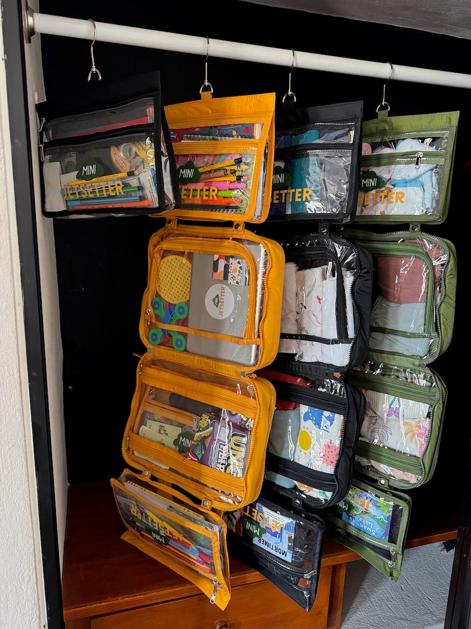Each kid gets one with 4 pockets: sock/underwear, tops, bottoms, and pajamas + mini bedtime books. And then we have a third bag with all of our travel toys. It makes things so much easier to keep organized — especially when everything is hung up at eye level instead of crammed into drawers or packing cubes.